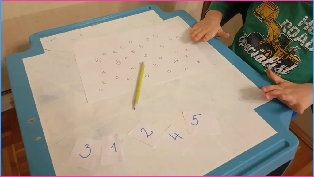 Rajzolj az egyik papírra sok apró dolgot (pl. köröket). A másik papírt vágd szét és a írd le a számokat egytől tízig, minden papírra egyet. A gyermek kezében legyen a ceruza. Véletlenszerűen mutass egy számot a kártyák közül, ő pedig kerítsen be egy zárt vonallal (karikázzon be) egy annyi darabból álló csoportot (pl. ha ötös van a papíron, 5 ábrát kerítsen körbe). A körök ne találkozzanak, tehát ne legyen átfedés a halmazokban.